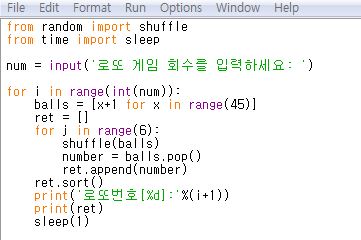 ramdom 모듈의 shuffle()과 time 모듈의 sleep()을 임포트합니다. sleep()은 1게임의 로또번호를 추출하고 잠시 지연 시간을 두고 다음 게임의 로또번호를 추출하기 위해서 사용할 것입니다.