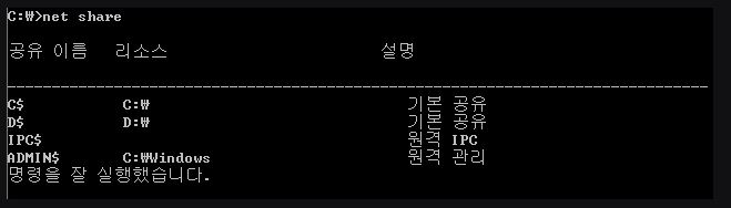 2. "net share" 명렁어를 입력하여 기본 공유 현황 확인(드라이브명+$)