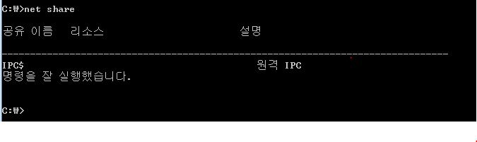 3. "net share [공유이름] /delete" 명령으로 기본공유 제거 후 "net share" 명령으로 확인