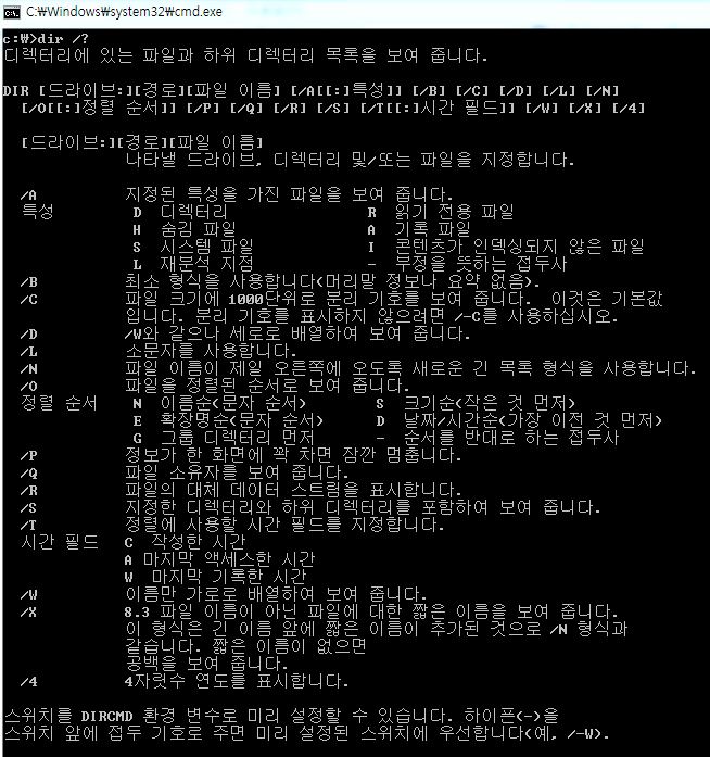 DIR [드라이브:][경로][파일 이름] [/A[[:]특성]] [/B] [/C] [/D] [/L] [/N]