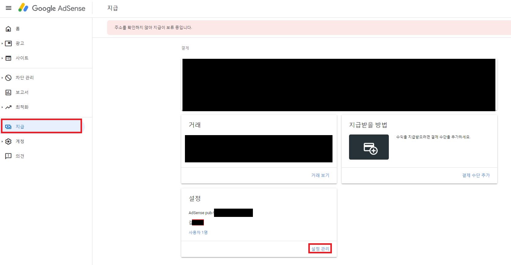 애드센스 메인화면에서 "지급"을 클릭 -> "설정관리" 클릭