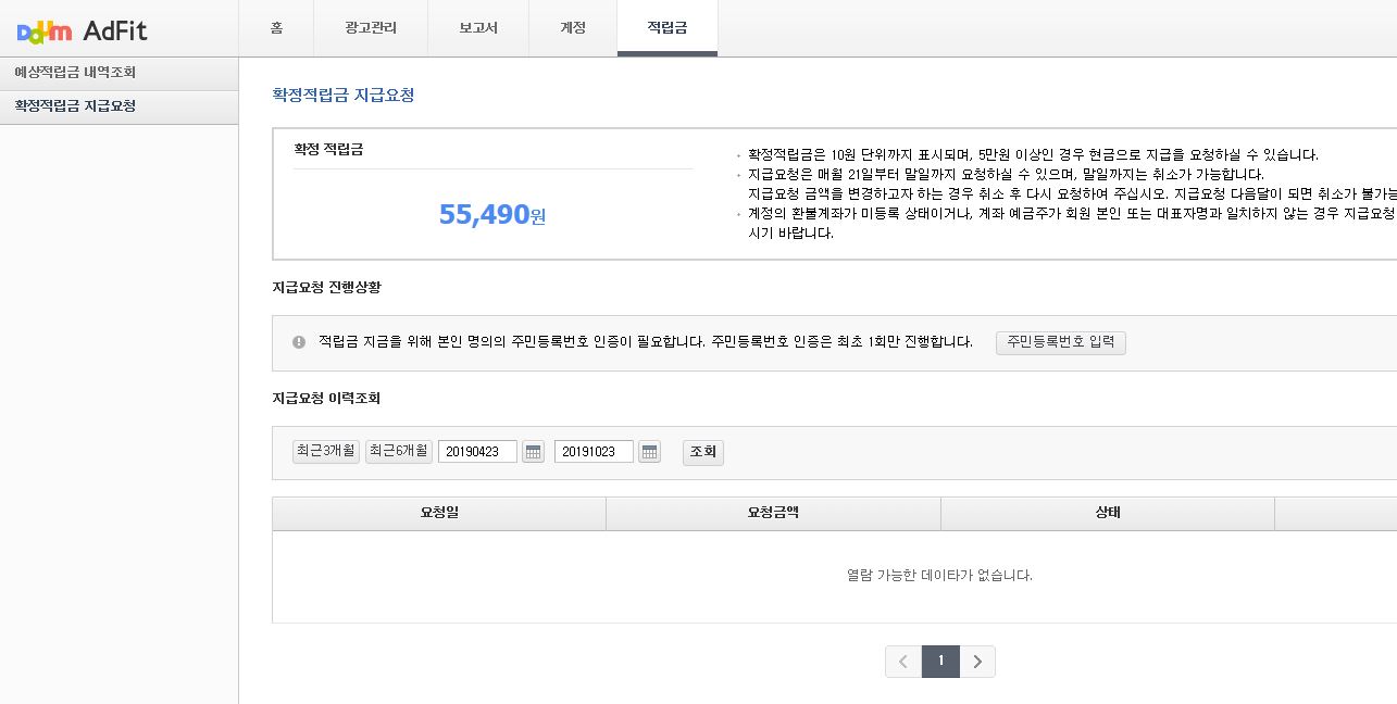 애드핏은 5만원이상에 수익이 있을때, 인출이 가능합니다. ㅎㅎ