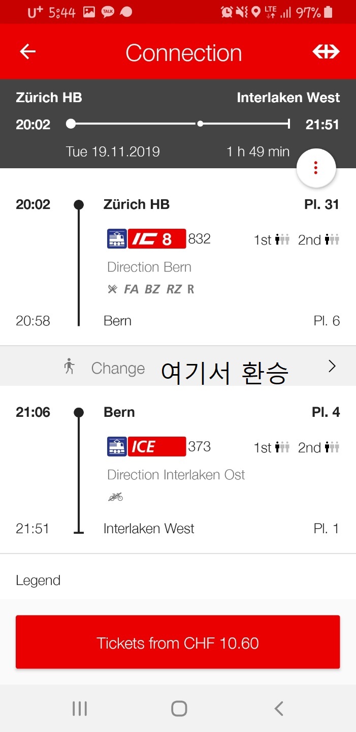 제가 취리히 공항에 18시20분 도착으로 21시06분 기차를 예매했습니다.
