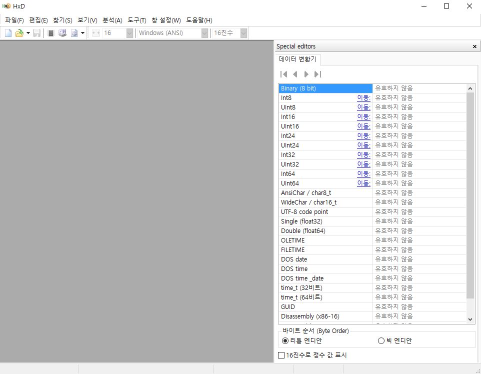 위 메뉴를 통해서 다운 받아서 실행하면 아래와 같은 Hxd 파일이 실행됩니다.