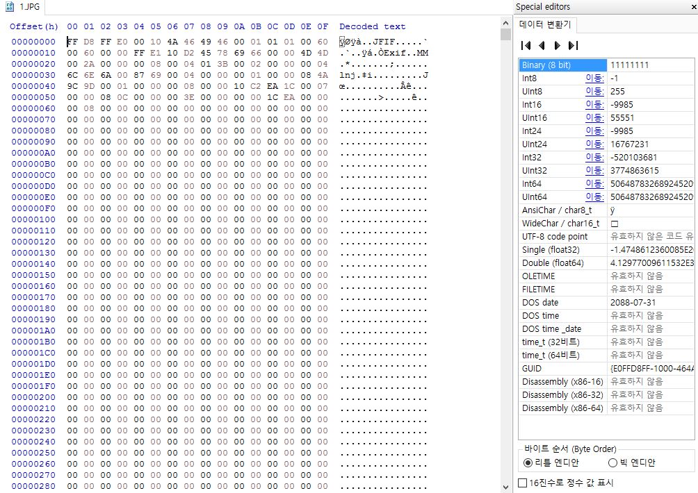 먼저 JPG 파일을 Hxd파일에 올려서 분석 해봤을때, 시작이 (FF D8 FF E0 00 10)으로 시작하고,