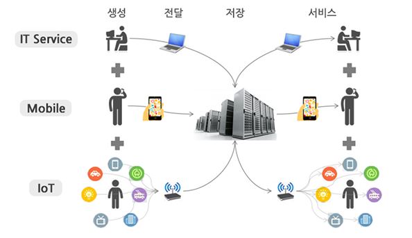 서비스 관점의 사물인터넷은 센서가 탑재된 다양한 디바이스들을 통해 이루어지는데, 의미 있는 센싱 정보들이 지속적으로 수집되고, 직/간접적으로 연결된 유/무선 네트워크를 통해 빠르고 안정적인 정보 송/수신이 됩니다.