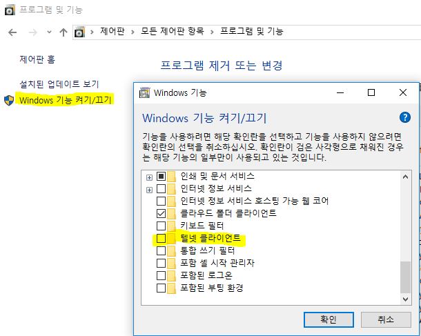 - Windows 기능에서 텔넷 클라이언트 기능을 선택