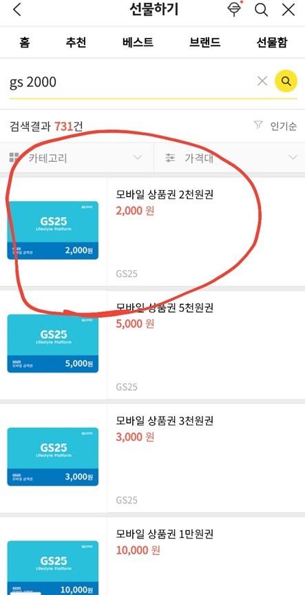 5. 제목처럼 GS 편의점 포인트를 사고 싶으면 선물하기에서 검색 후 나에게 선물하기하면되고 아마 다른 상품구매할때 포인트처럼 사용할 수 있을거같다.