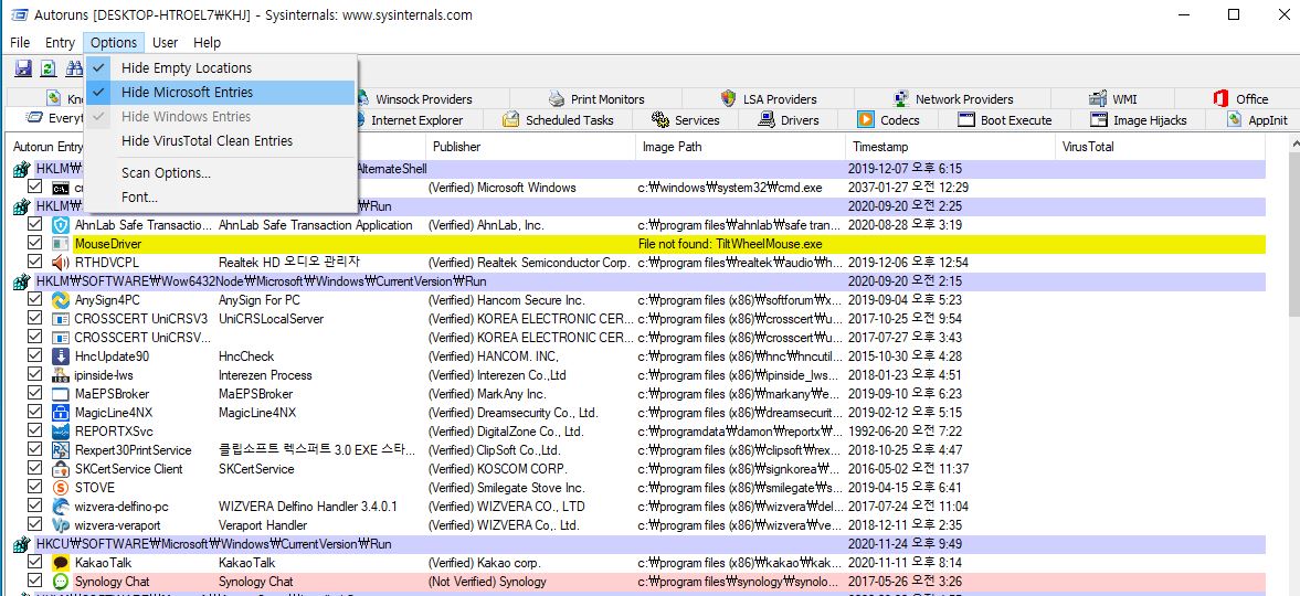 option -> Hide Microsoft Entrise 를 클릭하면 윈도우와 관련된 정상적인 정보는 숨긴 상태로 됩니다.