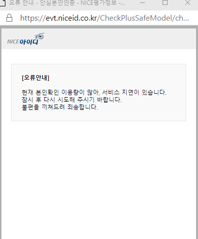 "현재 본인확인 이용량이 많아, 서비스가 지연이 있습니다. 잠시 후 다시 시도해 주시기 바랍니다. 불편을 끼쳐드려 죄송합니다."..