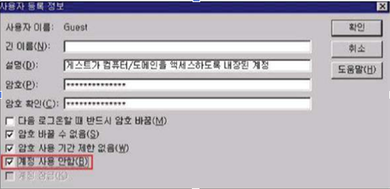 - 취약 : Guest 계정이 활성화 되어 있는 경우