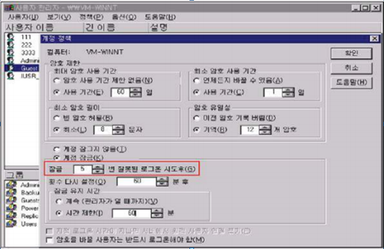 "계정 잠금" 선택 후 "잠금"에 "5"이하의 값 설정 ![]() |