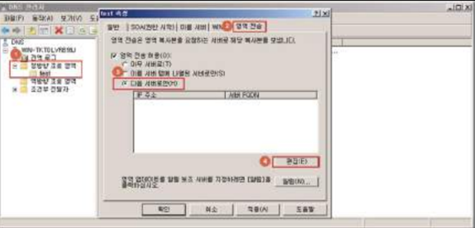 아래 경로를 참고하여 설정 확인 시작> 실행> DNSMGMT.MSC> 각 조회 영역> 해당 영역> 속성 |