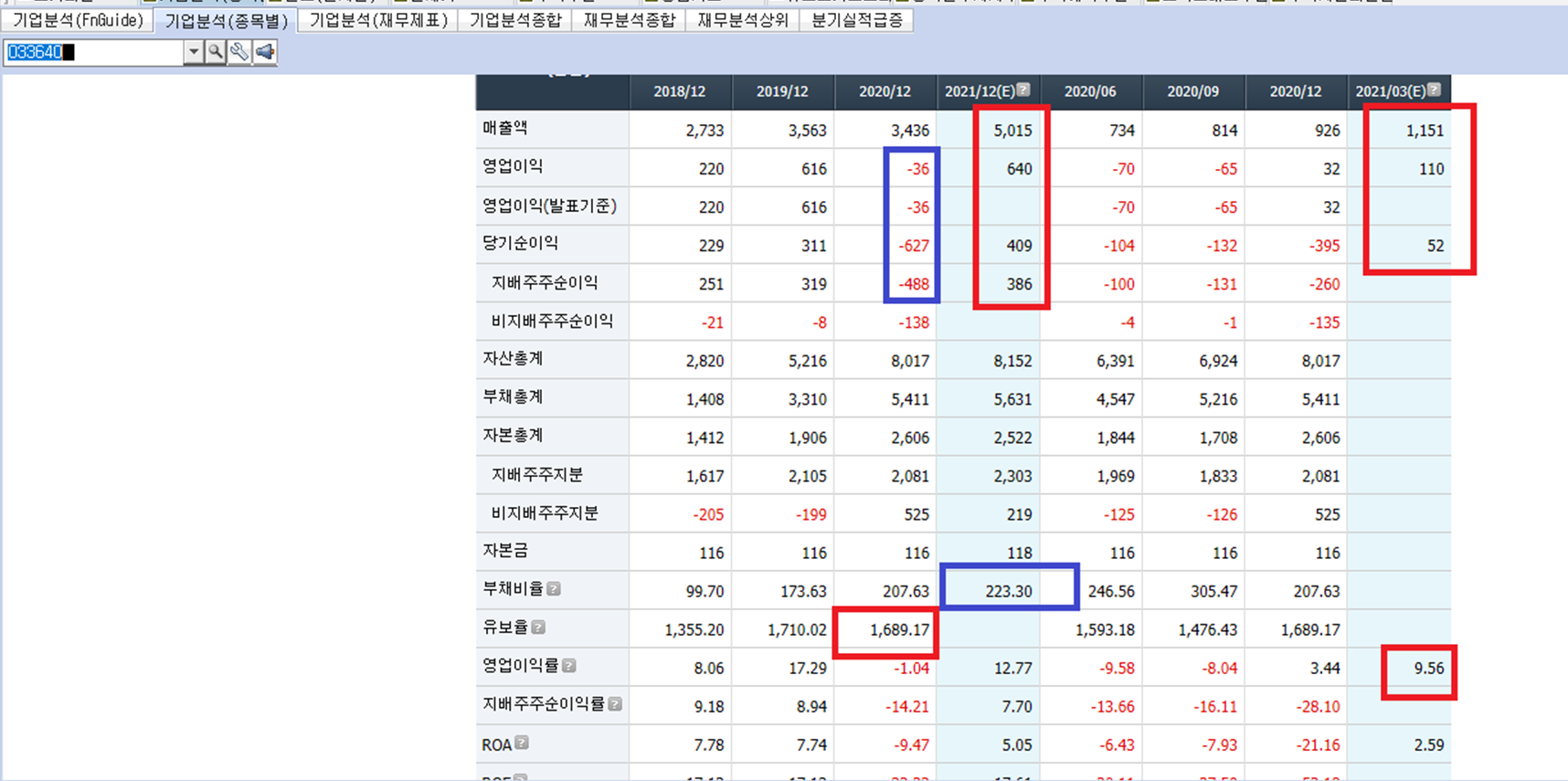 2020년 영업익 및 당기 순이익 적자 기록이나 2021년 예상 실적 대폭 호전