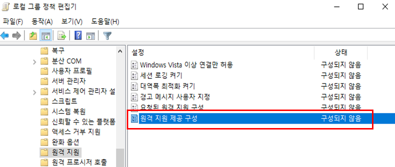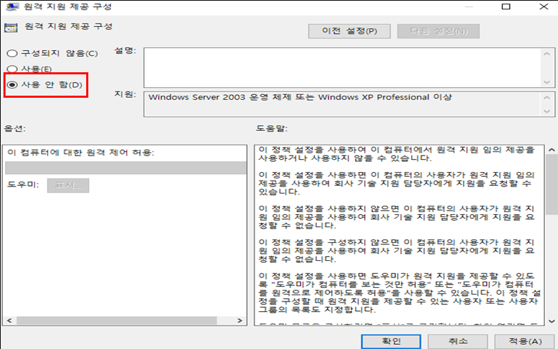 - 취약 : 원격 지원이 "사용"으로 설정 되어 있는 경우
