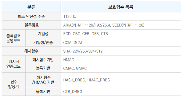 - 안전한 알고리즘 : SHA-256, AES, SEED, ARIA 등