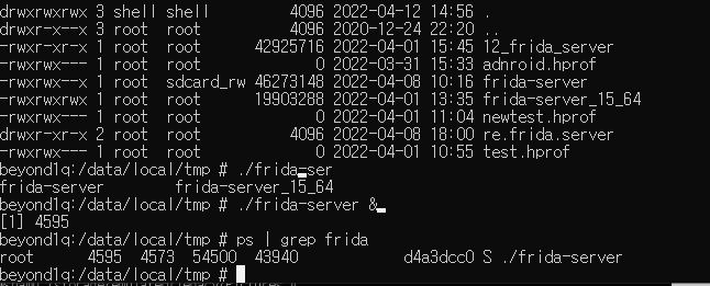 1. 다운받아 이동한 /data/local/tmp 폴더로 이동 후 frida-server 실행