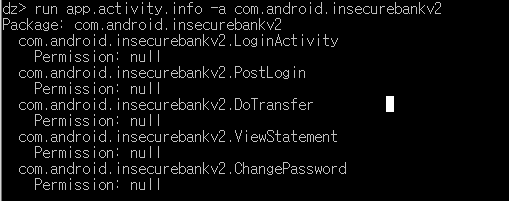 명령어 : run app.activity.info -a com.android.insecurebankv2