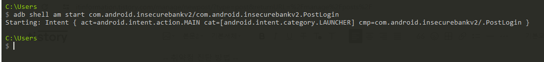 명령어 : adb shell am start com.android.insecurebankv2/com.android.insecurebankv2.PostLogin