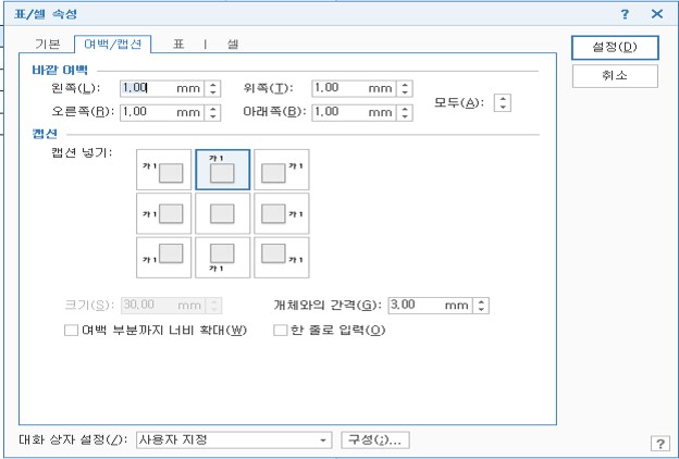 - 캡션 넣기에서 표 및 그림의 캡션 위치를 정한 후 설정을 누르면 표의 및 그림의 캡션이 설정된다.