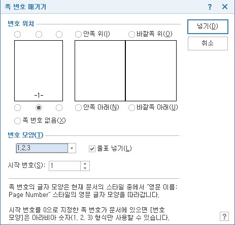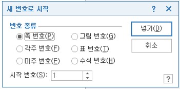 - 새 번호로 시작 창이 열리면 원하는 번호 종류에 체크 후 넣기 클릭 (ex. 페이지 설정)