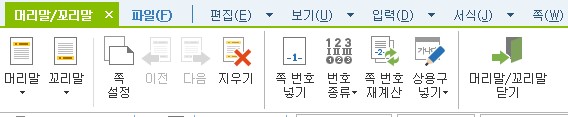 - [모양]-[머리말/꼬리말]에서 꼬리말을 설정 (단축키 : Ctrl+N,H) -> [쪽 번호 넣기] 클릭