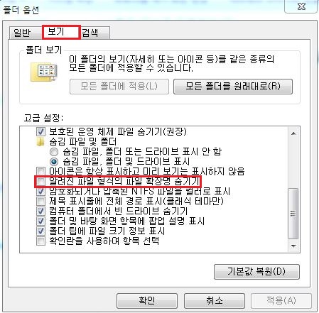 혹시 파일 확장자가 보이지 않으시는 분들은 아래와 같이 시도!