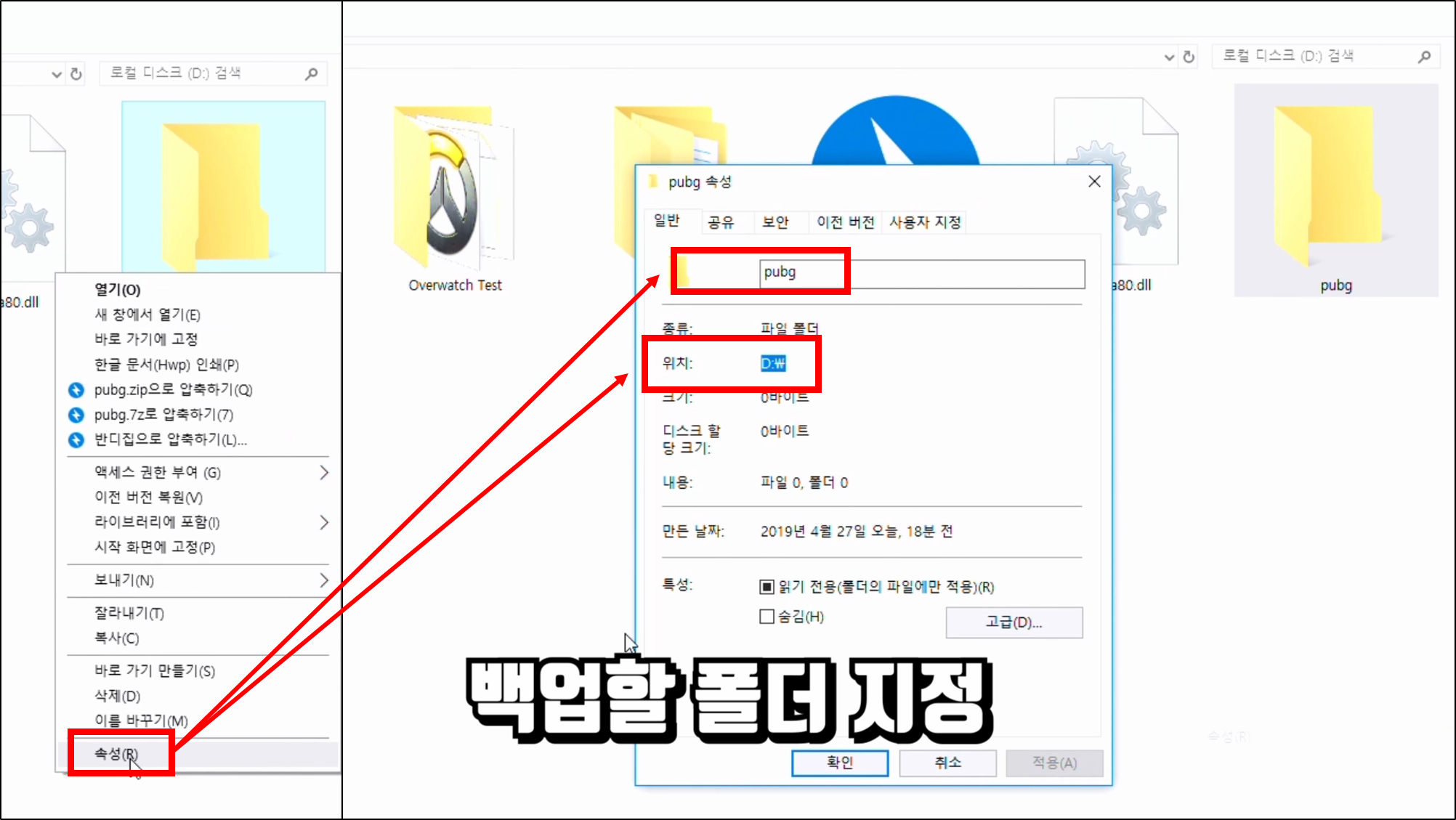 1) 저장되는 폴더의 속성 진입하여 위치와 폴더명을 복사