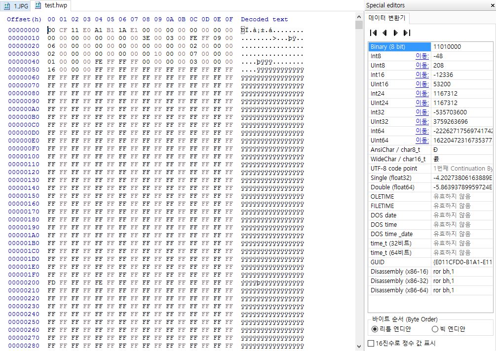 HWP 파일은 (00 CF 11 E0 A1 B1)으로 시작합니다.